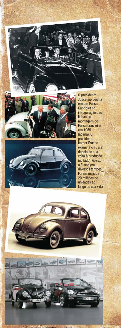 Em um período em que os carrões americanos dos anos 40 e 50 dominavam a paisagem de nossas ruas e estradas, o arredondado Fusca despontava como um ser estranho dentre os enormes monstros de linhas retas. Com seus parachoques exagerados e reluzentes e motores beberrões de seis ou oito cilindros, esses automóveis só serviam à parcela financeiramente abastada da sociedade. O Fusca surgiu como opção mais viável para a classe média, que começava a se fortalecer. O surgimento do Fusca nacional coincidiu com o processo de motorização em massa da sociedade brasileira, no início dos anos 60. Quem com mais de 40 anos de idade não tem boas histórias protagonizadas dentro de um Fusca? O carrinho passou a fazer parte da história da grande maioria das famílias brasileiras. Por isso esse carinho especial que, principalmente, os mais velhos ainda têm por ele. Algo estranho aos mais jovens.