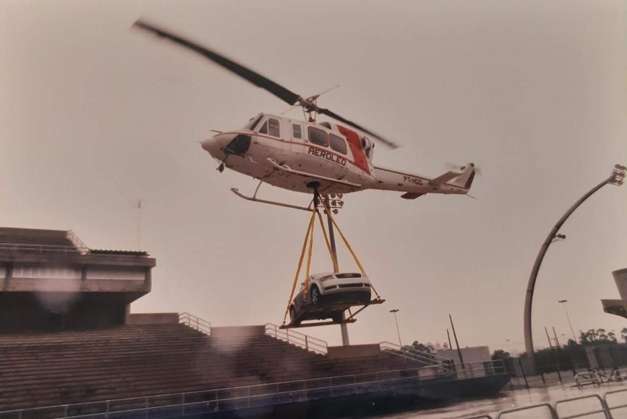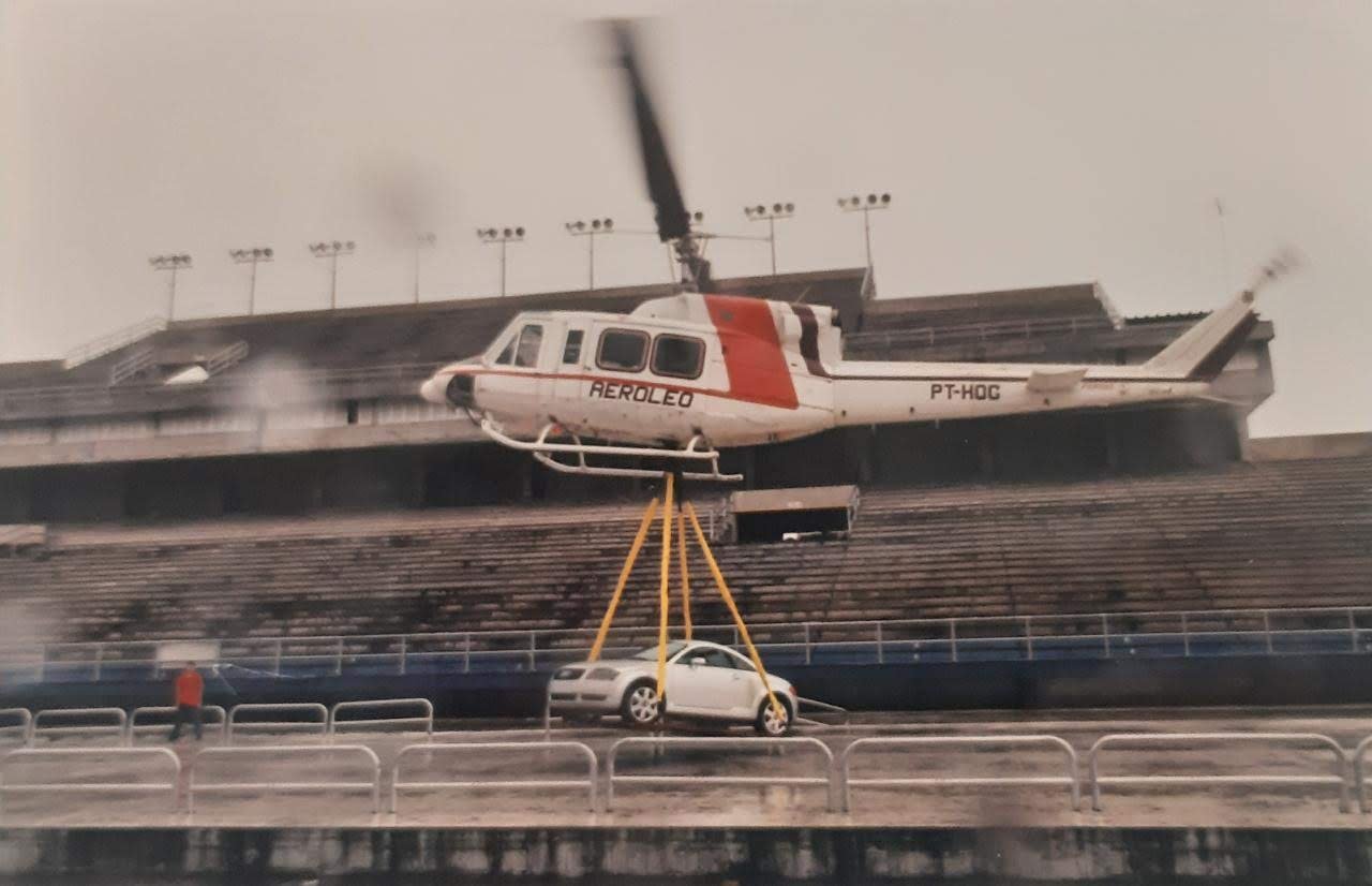 Foi aí que entrou em cena uma ideia que ninguém esqueceria tão cedo. O então assessor de imprensa da marca, o saudoso Charles Marzanasco Filho, decidiu que o TT não chegaria ao Salão de forma comum. A proposta era ousada: levar o coupê literalmente pelos ares até o evento.