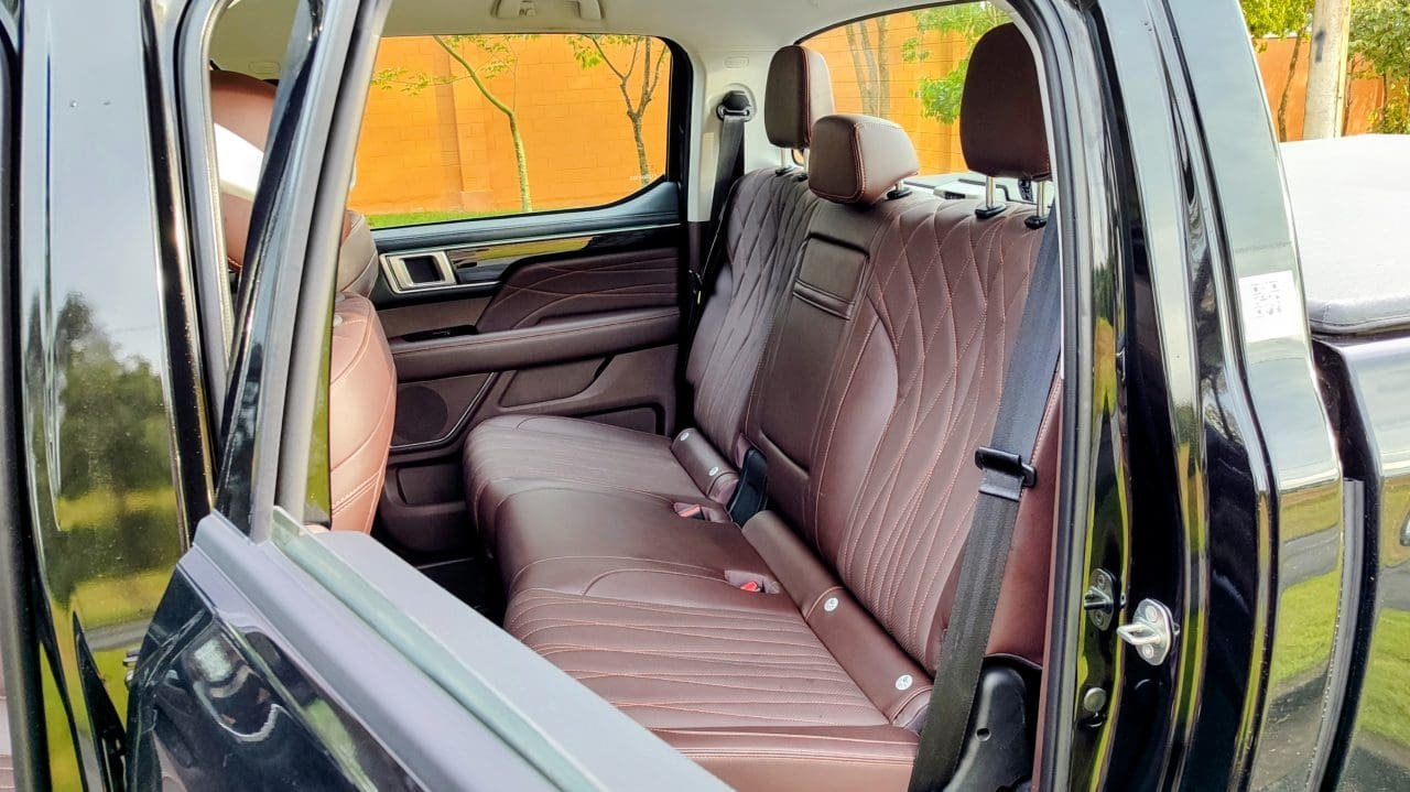 Cabine muito bem-acabada, bancos ergonômicos, luxo aparente e sistemas de ar-condicionado e som poderosos surpreendem para uma caminhonete chinesa novata. Seu posto de condução pode ficar consideravelmente baixo, de acordo com os ajustes de quem dirige, mas a coluna de direção peca pela regulagem apenas em altura, sem profundidade. Mancada das grandes.