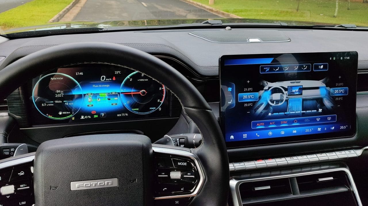 Mais uma vez, vale ressaltar o silêncio a bordo. A Foton não economizou nas mantas acústicas, que estancam não só o ruído do powertrain, como também os sons mundanos. Por essas e outras, a cabine da V7 torna-se muitíssimo agradável: quieta, com acabamento esmerado, janelas grandes, ar-condicionado poderoso, sistema de som competente, farto espaço interno e visual bonito, no geral.