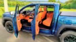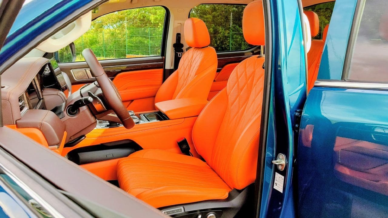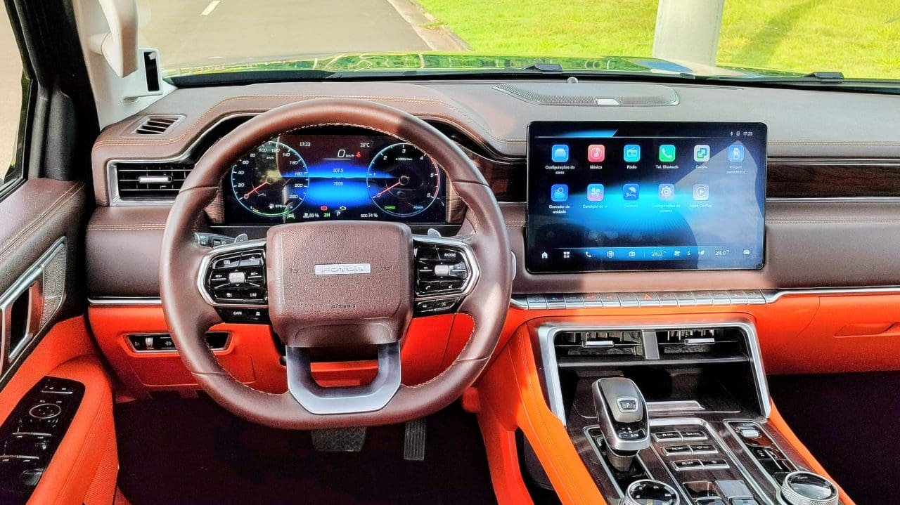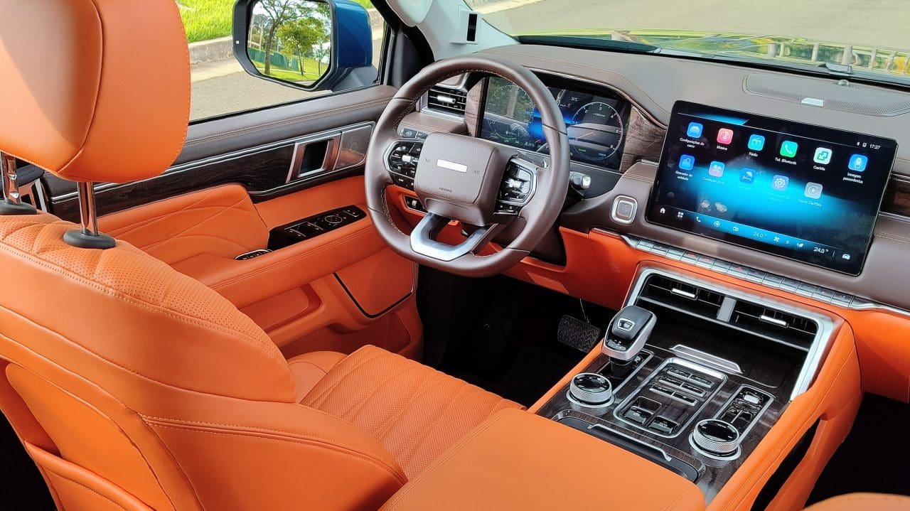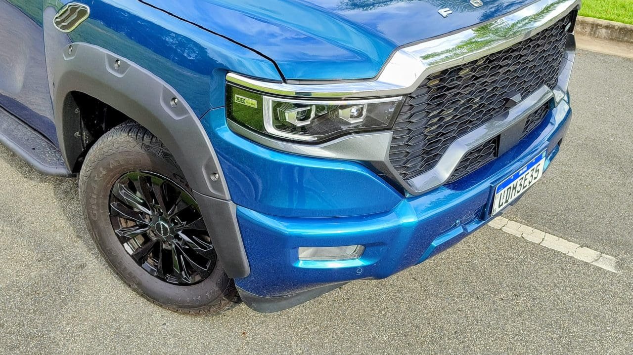 Pra uma, a Foton, chinesa, cobra R$ 290 mil, enquanto a outra sai por R$ 310 mil. A V9, de suspensões independentes, é a mais cara e recheada de equipamentos, e também tem um design que mistura Ram 1500 com Ford F-150. A cabine, ao menos, é autoral, mas com a aparência típica de carros chineses: console central elevado e uma enorme multimídia no centro. Essa paleta de cores exótica do carro avaliado (carroceria verde com interior em cor de abóbora e marrom) pode ser trocada por tons escuros e mais discretos.