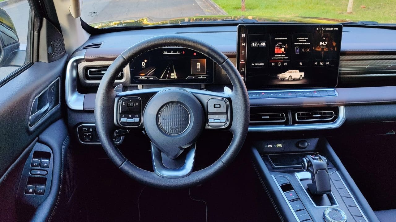 A telona central combina com o painel de instrumentos digital, valorizando a cabine da Poer P30. Não que isso seja necessário: há um ótimo nível de acabamento e bons materiais que revestem bancos, console, apliques do painel e laterais das portas. É comum, nos carros chineses, esse esmero, que melhora bastante o bem-estar a bordo. Faz até esquecer, por exemplo, o fraco sistema de som que a GWM instalou nessa sua picape.