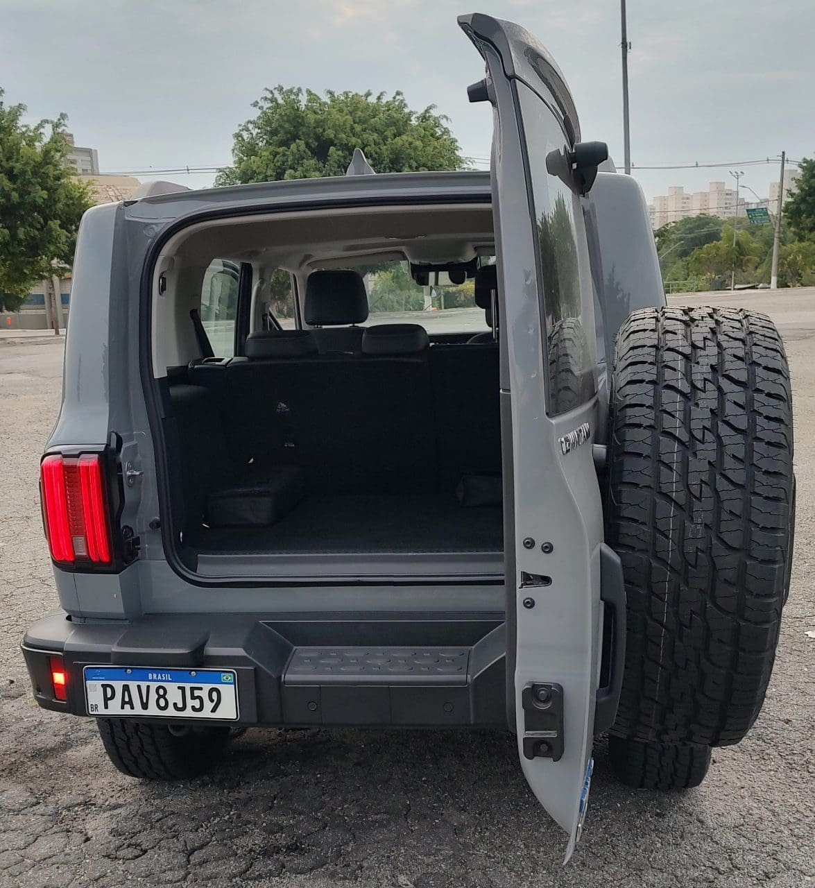 Só para ter base, o jipão que tem faróis redondos cortados por uma faixa de LEDs, para-choque parrudo, carroceria quadrada e estepe pendurado na tampa traseira (com abertura lateral) tem, de acordo com a ficha técnica fornecida pela GWM, 4,76 metros de comprimento, 1,93 m de largura, 1,90 m de altura e vastos 2,75 m de espaço entre-eixos. Desse modo, cinco adultos viajam com folga a bordo do Tank 300.