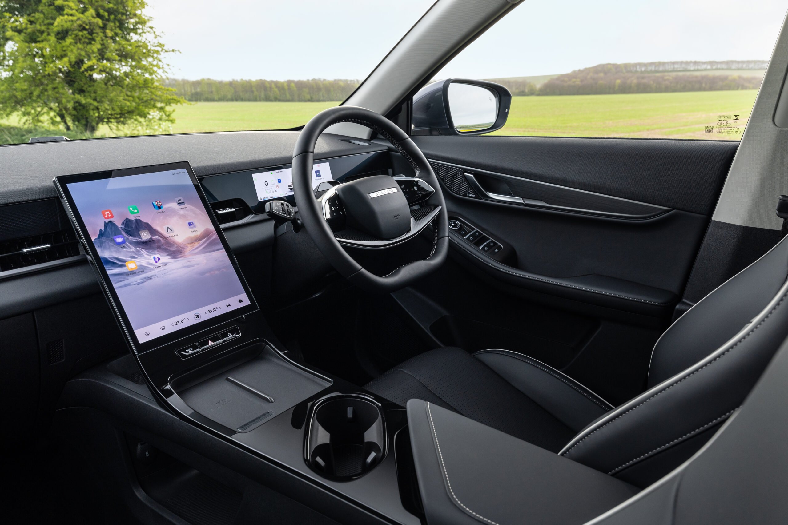 A cabine é bastante similar à do Jaecoo 7 no design, com linhas horizontais e uma tela central grande e vertical, que reúne mais comandos do que seria adequado.