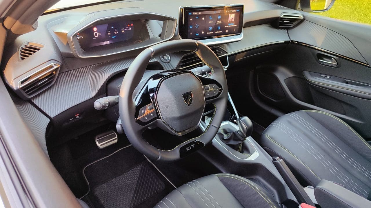 Espaço traseiro limitado à parte, quem curte uma tocada diferenciada e posto de condução mais sport, dificilmente não vai gostar desse Peugeot 208 GT. Os bancos dianteiros são grandes e ergonômicos (roubam um pouco do espaço traseiro, também), sustentando o motorista com competência nas curvas rápidas. O pequeno volante oval de dois raios, tradição recente da marca francesa, casa bem com o painel alto, com instrumentação digital e multimídia elevados (o famoso i-Cockpit).