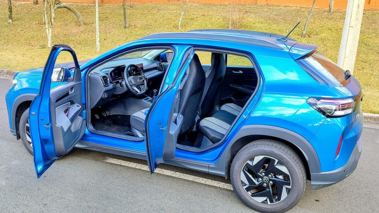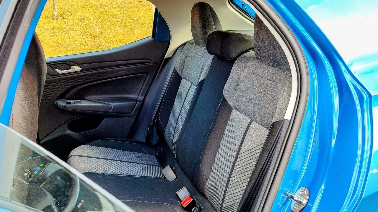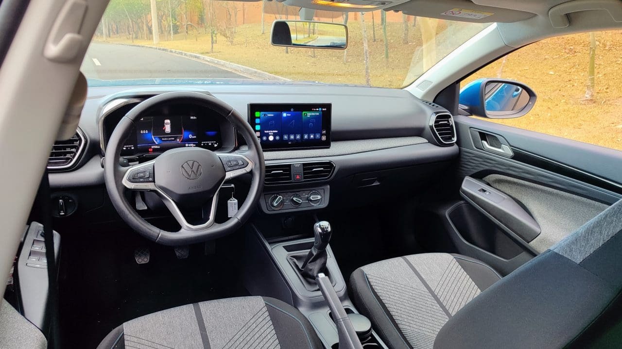 Essa nova fórmula de cabines da Volks ainda inclui um acabamento surpreendentemente bom (tecido nas portas e painel, black piano, plásticos texturizados), e visual que não cansa, especialmente das telas (o layout da multimídia, inclusive, é bonito e funcional). Só os bancos dianteiros, com encosto de cabeça fixo, podem ficar um pouquinho estreitos para quem for mais corpulento. Questão de costume, já que densidade de espuma e tecido da forração são corretos.