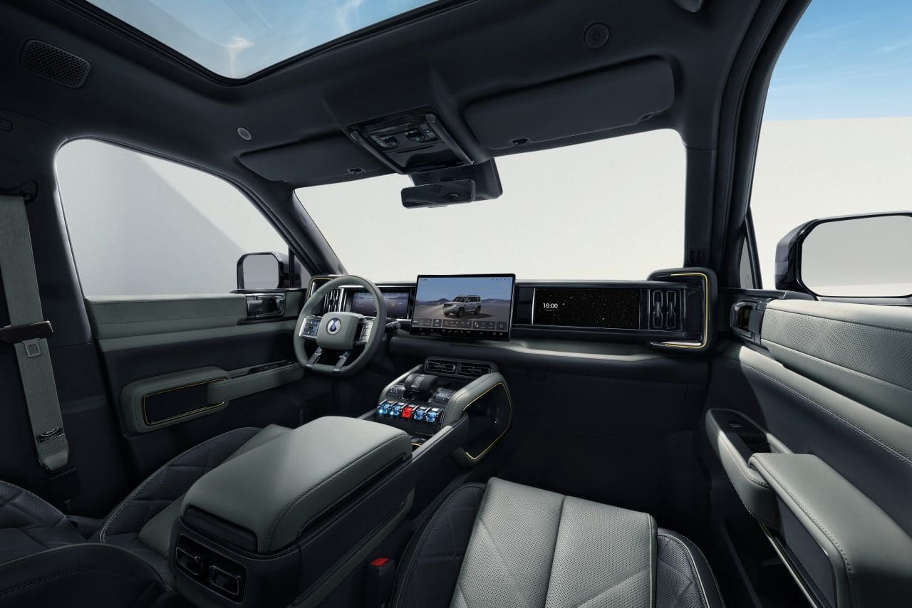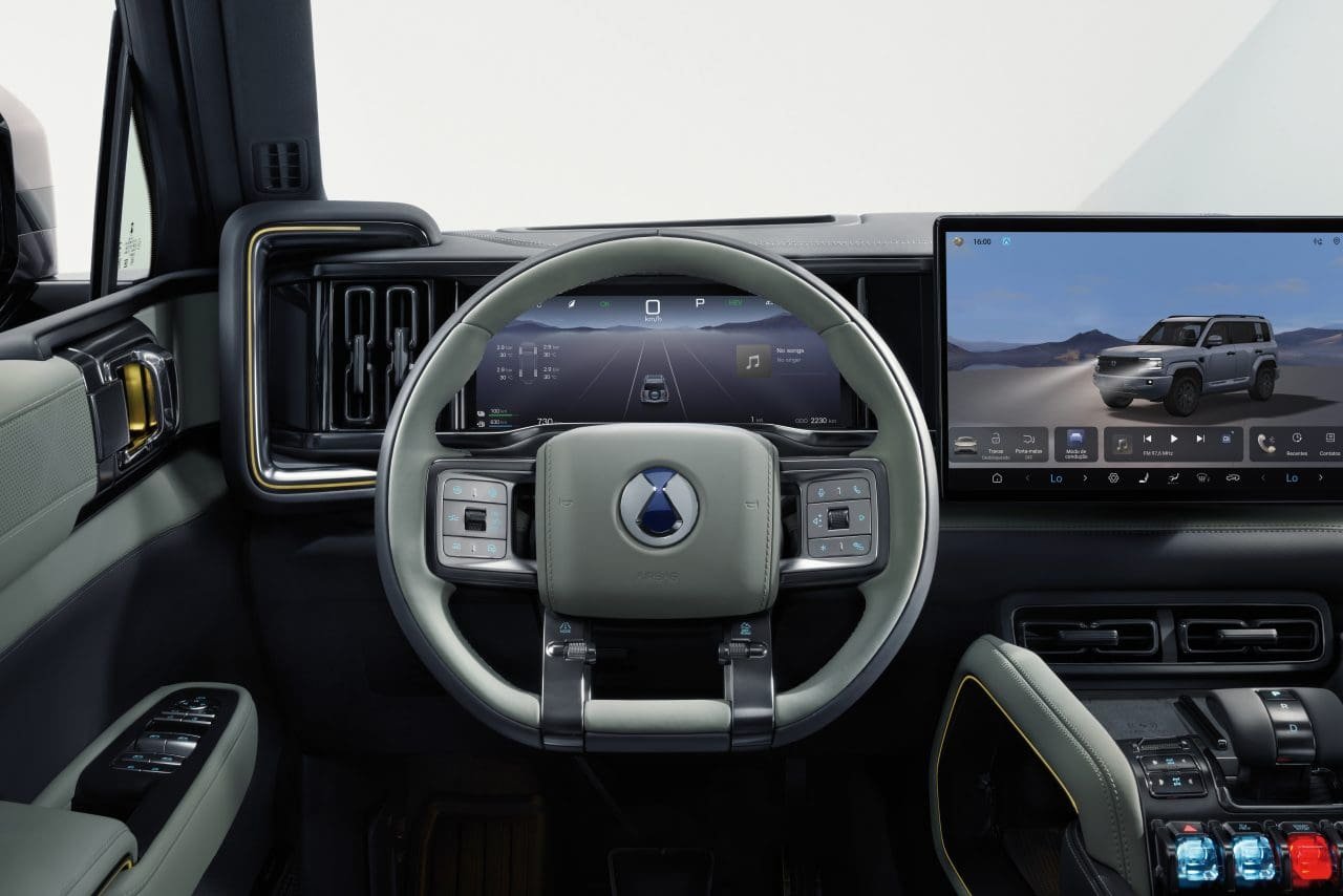 O SUVzão off-road é bem construído: tem baterias de tração integradas ao chassi (mais seguro e rígido na estrutura), suspensões independentes nas quatro rodas (tipo “Duplo A” nos dois eixos) e hidropneumáticas (controle hidráulico e pneumático da carroceria), amortecedores com carga autoajustável, freios a disco ventilado nas quatro rodas e capacidade de rebocar até 2.500 kg.