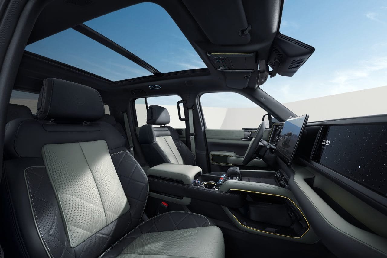 Mais: câmeras 540º, tela de entretenimento para o copiloto (12,3”), painel de instrumentos digital (12,3”), multimídia com internet a bordo e conexões sem fio (15,6”), head-up display, 11 airbags, um enorme pacote ADAS, rodas aro 20 com pneus ATR de perfil 275/55, tampa elétrica do porta-malas, bancos traseiros com ventilação e aquecimento, entre outros.