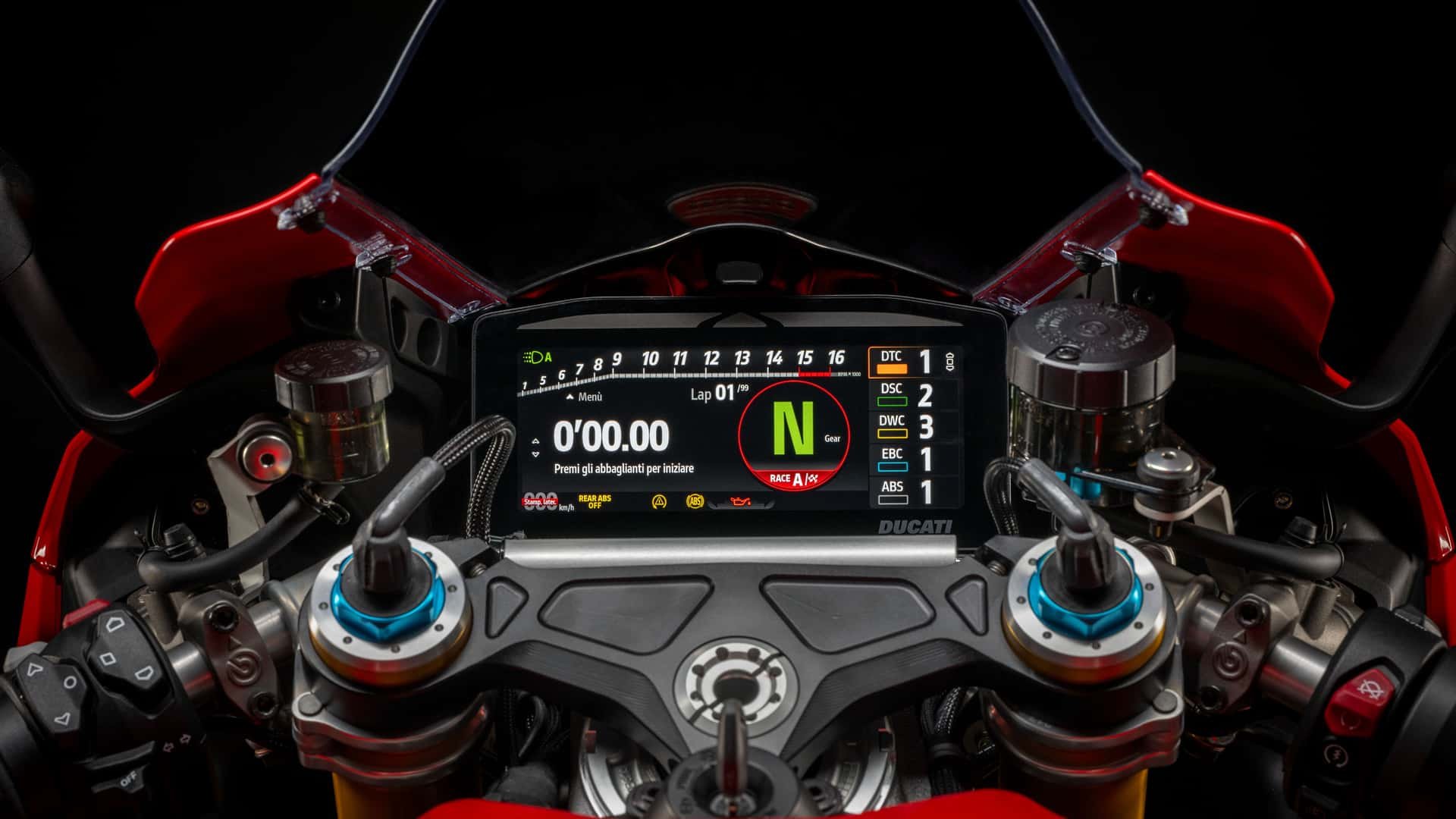 No pacote de equipamentos da Panigale V4 há painel de instrumentos digital de 6,9”, controle eletrônico de largada, controle eletrônico de tração, suspensão eletrônica ativa, freio-motor ajustável, seletor de modos de pilotagem, conjunto óptico full-LED, além de uma série de sistemas de segurança e performance. Pode trazer ainda piloto automático, monitor de pressão dos pneus (TPMS) e sistema de navegação GPS, itens opcionais.