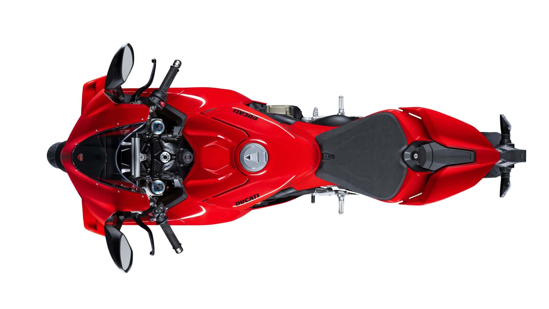 No design da nova Panigale V4, inspiração na tradicional Ducati 916, com linhas atualizadas e mais fluídas, que melhoram o coeficiente de arrasto aerodinâmico em até 4%, segundo a marca. No pacote ainda estão banco e tanque redesenhados, pedais realocados e mudanças nos comandos do guidão, tudo em prol da melhor ergonomia e menos esforço físico do piloto na condução, especialmente em maiores velocidades.