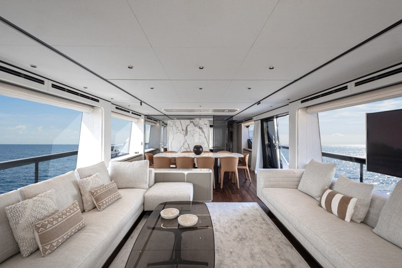 Tem, ademais, amplas superfícies envidraçadas – incluindo janela de altura total na área de jantar – e salão principal com quase 30 metros quadrados. O ambiente, a princípio, conecta-se ao cockpit por meio de porta deslizante em vidro, ampliando a área social.