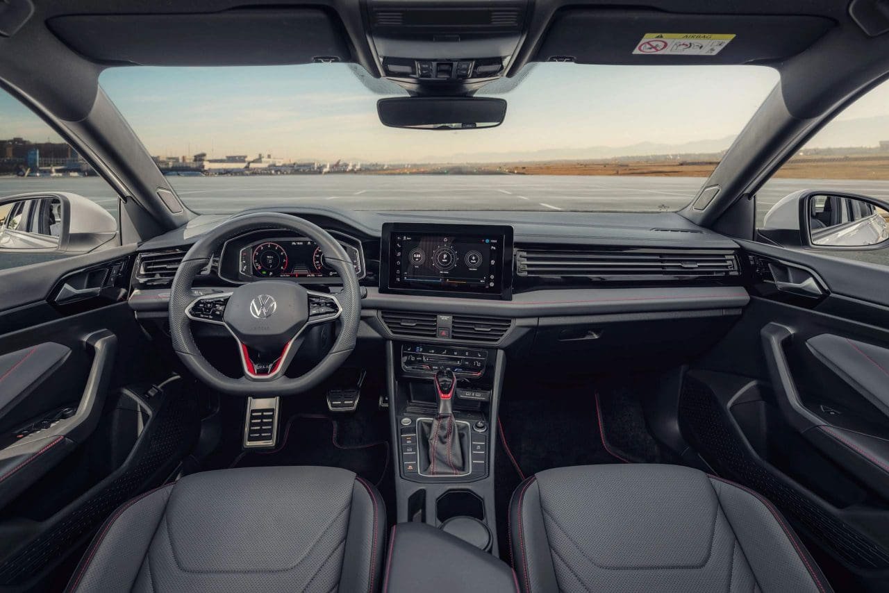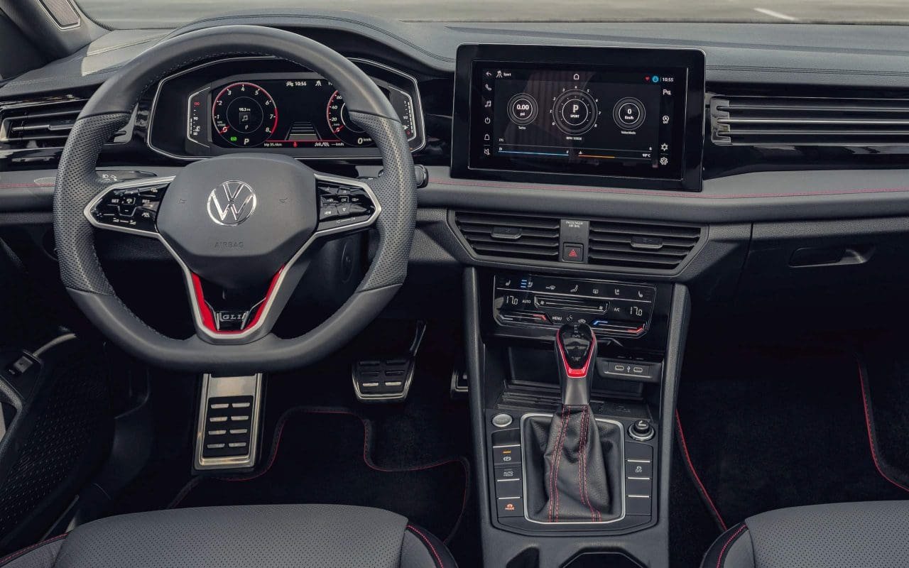 Nessa linha 2026, o Jetta GLI ganha traços mais modernos, limpos e arredondados, como manda a nova identidade visual da VW para o mundo. Na frente, os faróis são interligados por uma barra de LED iluminada, enquanto a traseira tem a tampa do porta-malas atravessada por um aplique vermelho que une as lanternas. Na cabine, acabamentos e materiais inéditos, além de volante, controles de ar-condicionado e multimídia renovados (essa agora está mais saltada, no estilo semiflutuante).