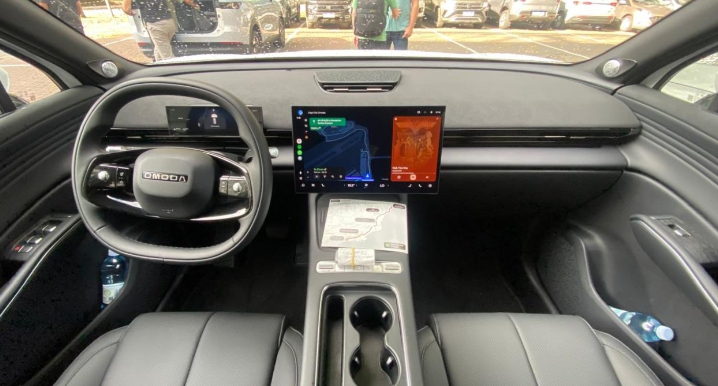 No interior, há uma tela de 24,6 polegadas, que integra o painel de instrumentos e a multimídia – semelhante ao Omoda E5.