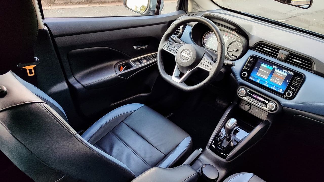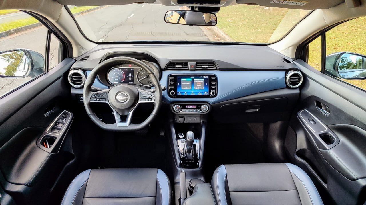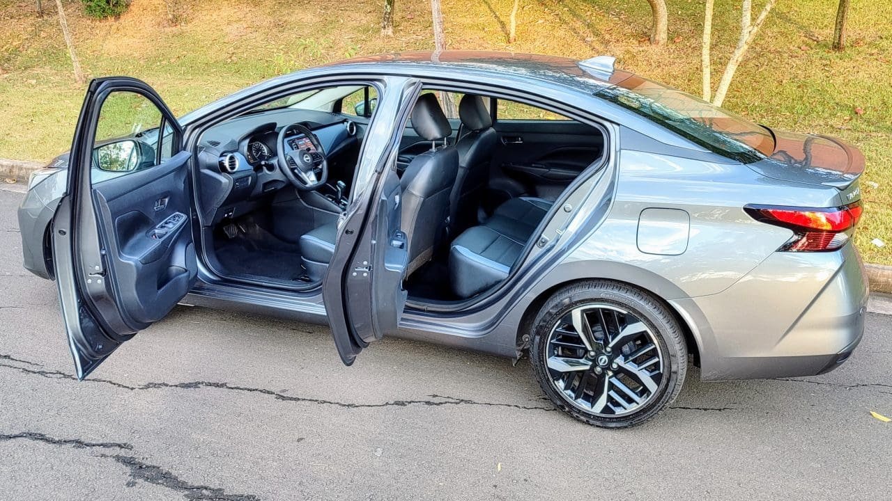 De série, essa versão Exclusive do Nissan Versa 2026 vem completona, com direito a rodas de liga aro 17 diamantadas, ar digital automático, bancos em couro sintético, sensor crepuscular, apoios de braço para os bancos dianteiros e traseiro, chave presencial, partida por botão, carregador de celular sem fio, piloto automático, volante multifuncional regulável em altura e profundidade, instrumentação com tela de 7 pol., tag Sem Parar, faróis em LED e multimídia de 8 pol.